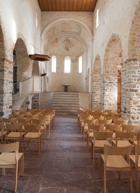 Around 1000 A.D. or towards the mid-11th c. this first church was replaced by the current church. It was possibly with this in mind that the tower was constructed. Due to its location on the steep promontory, the church was accessible through a steep stair in the west. The Spiez Castle Church is a great conserved example for the early Romanesque architecture. The three-nave, flat-ceilinged pillar basilica with four bays has a vaulted chancel with a raised middle apse over the large crypt and two lateral secondary apses, all three with anterior bays. The structures of the central nave and the flanking aisles, of the bay of the main choir and the apses are staggered in height. Originally the masonry was grouted so the face of the stones was exposed (pietra rasa technique, visible in the south apse), but has certainly been smoothly plastered since the late Middle Ages. The barrel-vaulted inner raised choir is reached via nine stone steps and opens onto the quadratic front bays of the secondary apses via low arcades. Simple stucco work from 1670/76 decorates the slightly protruding choir arch, the connecting arcades, and the recess to the apse. In the north-west corner the tower is located and was incorporated in the building when the current church was constructed. The apses are articulated with pilaster strips and a frieze of blind arches.
