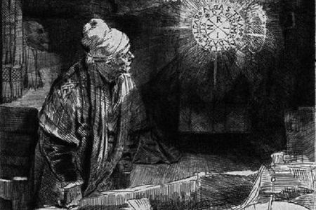 Rembrandt, Faust in der Studierstube, eine magische Erscheinung betrachtend. – Der heilige Paulus (Ausschnitt), um 1652, Radierung, Kaltnadel und Grabstichel, 20.9 x 16 cm, Kunstmuseum Basel, Kupferstichkabinett, Schenkung Eberhard W. Kornfeld, Bern