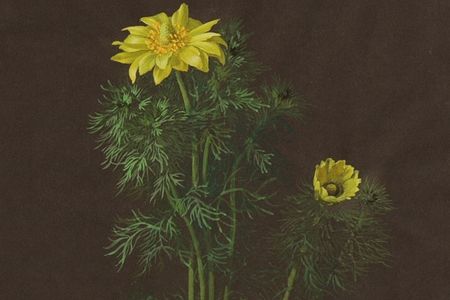 Ernst Kreidolf, Bergblumen II: Alpiner Adonis, Adonis Alpinum, um 1918, Deckfarben auf schwarzem Papier, 30,3 x 24,9 cm, Kunstmuseum Bern, Verein Ernst Kreidolf © 2017 ProLitteris, Zürich