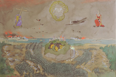 Ernst Kreidolf, Kriegsdarstellung,Bleistift, Tusche, Aquarell auf braunem Papier auf Karton, 32,6 x 45,4 cm, Kunstmuseum Bern, Verein Ernst Kreidolf © 2017 ProLitteris, Zürich