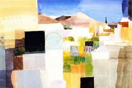 Mitte der 1910-er Jahre rückte jedoch das Aquarell ins Zentrum seines Schaffens, diese Technik ermöglichte es Moilliet, auf seinen vielen Reisen an Ort und Stelle mit einfachen Mitteln zu malen. Genau so wichtig war aber auch die Qualität der Aquarellfarbe, die Subtilität des Mischens und Kombinierens verschiedener reiner Farbtöne. In Tunesien, Marokko, Spanien, auf Mallorca, in Deutschland und in der Schweiz entstand so ein umfangreiches Werk auf Papier. Moilliet war ein Reisender, auch im übertragenen Sinn, indem er die oft transparente, starke Leuchtkraft der Aquarellfarbe als Hauptelement der Bildkomposition einsetzte und mit Farbklängen eine räumliche Wirkung erreichte. Werke und Dokumente aus seiner künstlerischen und literarischen Umgebung, so z.B. von August Macke, Paul Klee und Hermann Hesse ergänzen die Ausstellung ideal.