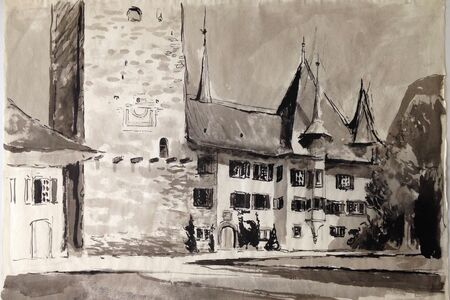 Victor Surbek, Schlosshof Spiez (Ausschnitt), undatiert, Tusche auf Papier, Stiftung Schloss Spiez, Schenkung Surbek-Frey