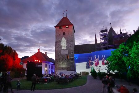 Aussenprojektion aufs Baugerüst mit Werken des Videokünstlers Peter Aerschmann 2021. Ermöglicht durch das Engagement des Fördervereins "Freunde Schloss Spiez".