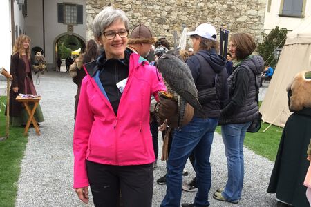 Begegnung mit dem Falken - Doris Ifanger (Vorstand). Die Vorstandsmitglieder helfen mit am Schweizer Schlössertag, an dem das Schloss jeweils ein Mittelalterfest anbietet.