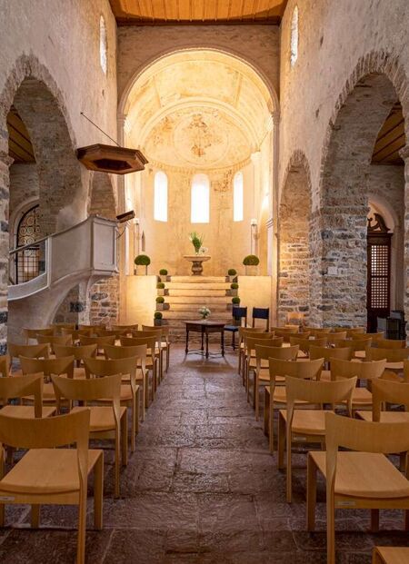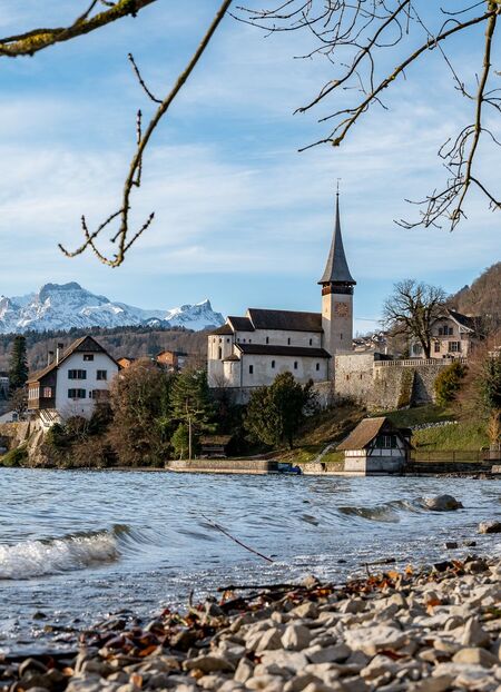 Das Patrozinium der Kirche ist unbekannt; der vielfach angenommene Heilige Laurentius ist nicht belegt. Man weiss nur von einem 1361 bestehenden und einige Jahre zuvor gestifteten Katharinenaltar. Die Kirche des 7./8. Jahrhunderts ist ein sehr schönes Beispiel für eine «Eigenkirche», das ist ein Gotteshaus, das von lokalen Adligen im Zug der frühmittelalterlichen Christianisierung errichtet worden war und sowohl als privilegierte Adelsgrablege und Totenmemoria wie auch als Gemeindekirche diente. Meist wurden solche Eigenkirchen beim Wohnsitz des Kirchengründers erbaut. Darum ist zu vermuten, dass dieser in Form eines frühmittelalterlichen Herrenhofes oder als frühe Holz-Erde-Burg im Bereich des heutigen Schlosses stand. Der Kirchensatz blieb denn auch in der Folge in den Händen des jeweiligen Schlossherrn.