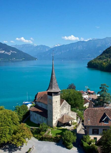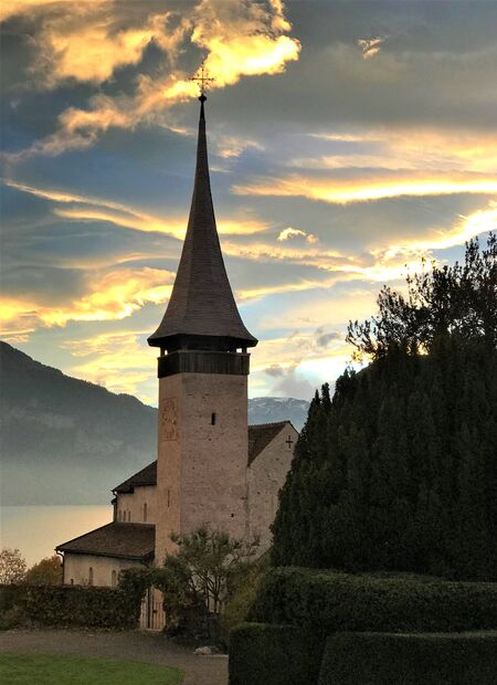 Der Chronist Elogius Kiburger behauptet um 1466, der noch heute bestehende Bau habe einem Chorherrenstift gedient, wofür in der Tat die Krypta, aber auch die grossartigen Malereien sprechen könnten. Bereits 1228 ist er jedoch nur als Pfarrkirche von Spiez bezeugt, eine Funktion, die er ins 20. Jahrhundert erfüllte.