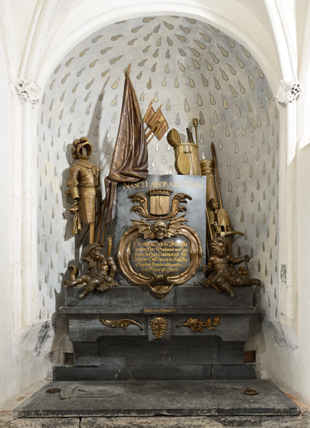 Die Kirche diente nicht nur als Pfarrkirche, sondern lange auch als Memorialbau und Grablege der jeweiligen Schlossbesitzer. So wurde etwa Jeanne de la Sarraz, seit 1457 die zweite Gemahlin von Adrian I. von Bubenberg, dort bestattet. Aber vor allem die Adelsfamilie von Erlach ist in der Kirche präsent. Neben vielen Wappen in Form von Glasscheiben, Malereien und Stuckskulpturen sind die beiden Seitenapsiden zentral, die von den Erlach zu eigentlichen Grabkapellen ausgebaut wurden. Die südliche Seitenapsis beherbergt das Epitaph von Franz Ludwig von Erlach († 1651), das nördliche Pendent liess Sigmund von Erlach (1614-1699) als sein Mausoleum einrichten. Diese Periode endete definitiv 1875 mit dem Bankrott des letzten Schlossbesitzers aus dieser Familie, Ferdinand von Erlach.