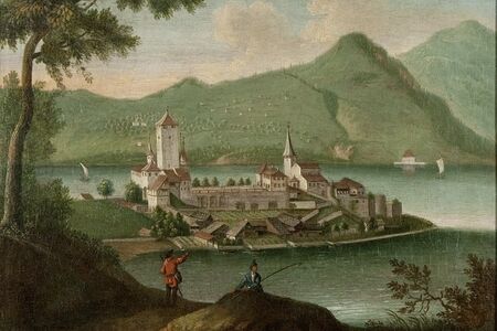 Anonym, Schlosshalbinsel, um 1730, Öl auf Leinwand, 38 x 46,2 cm, Stiftung Schloss Spiez